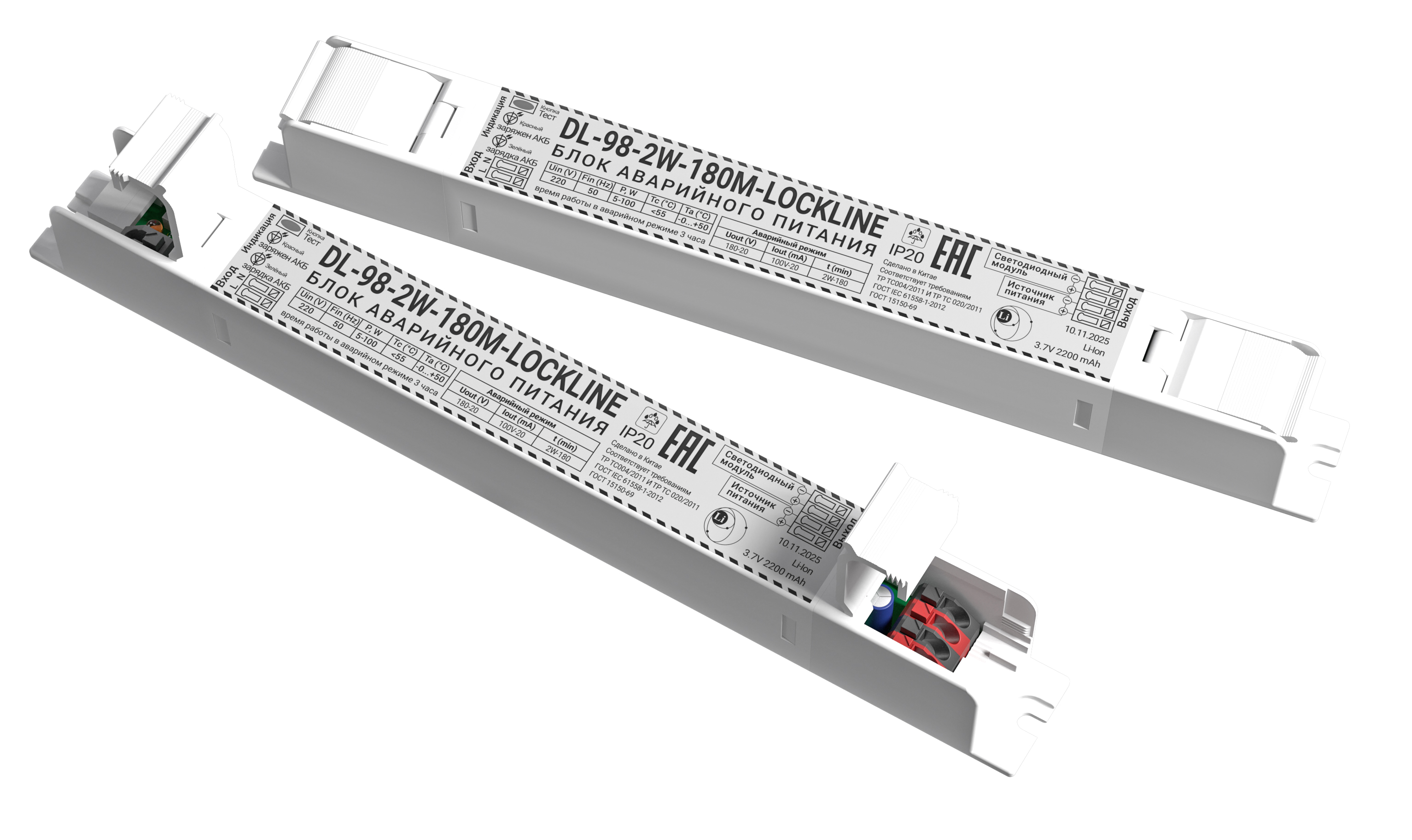 DL-98-2W-180M-LOCKLINE DIOLIGHT, Блоки аварийного питания для светодиодных светильников, Ток вых. макс, мА: 35 мА; Степень защиты IP: IP20; Диапазон T раб., °С: 0 – +55; Тип аккумуляторной батареи: Li-ion 3,7В/2200 mAh; P макс. аварийная, Вт : 3.5 Вт; Аварийный режим, минут: 180