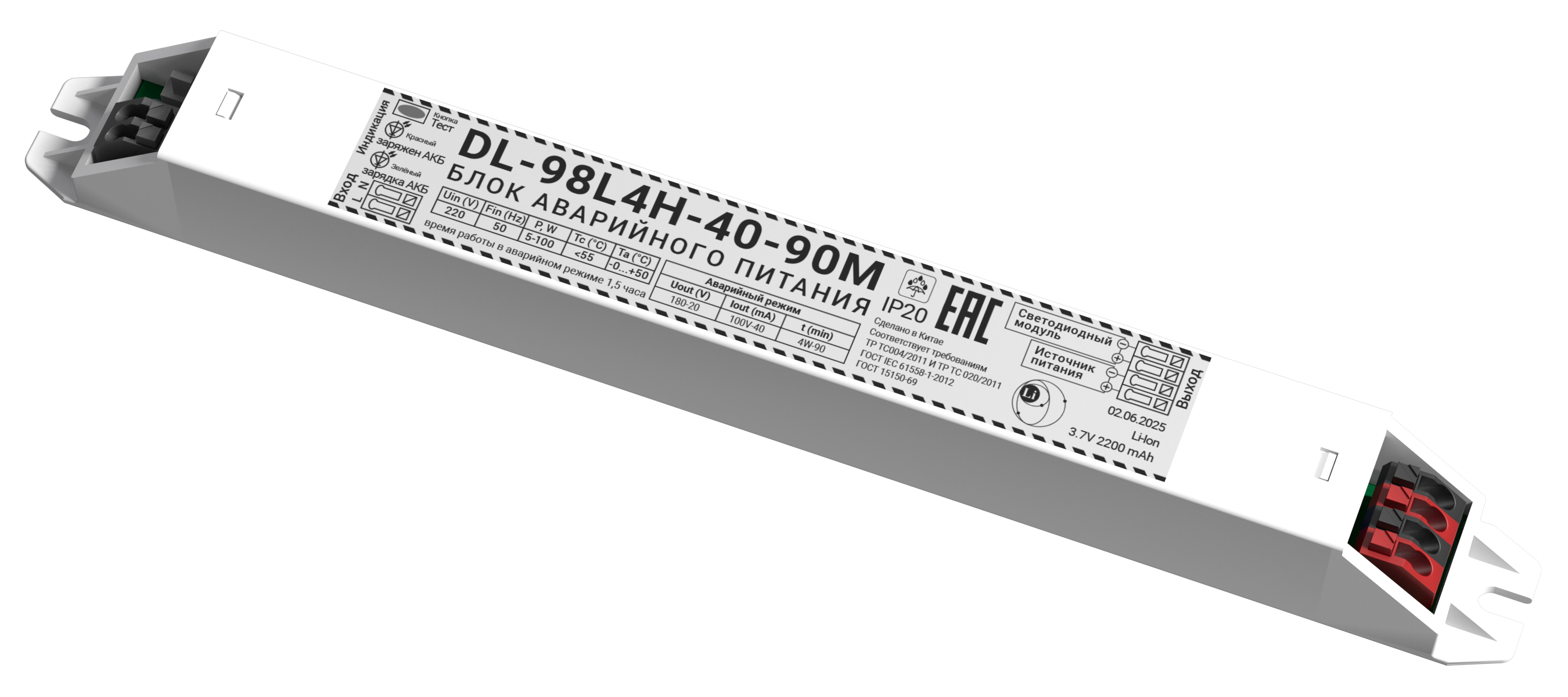 DL-98L4H-40-90M DIOLIGHT, Блоки аварийного питания для светодиодных светильников, Ток вых. макс, мА: 40 мА; Степень защиты IP: IP20; Диапазон T раб., °С: 0 – +55; Тип аккумуляторной батареи: Li-ion 3,7В/2200 mAh; P макс. аварийная, Вт : 4 Вт; Аварийный режим, минут: 180