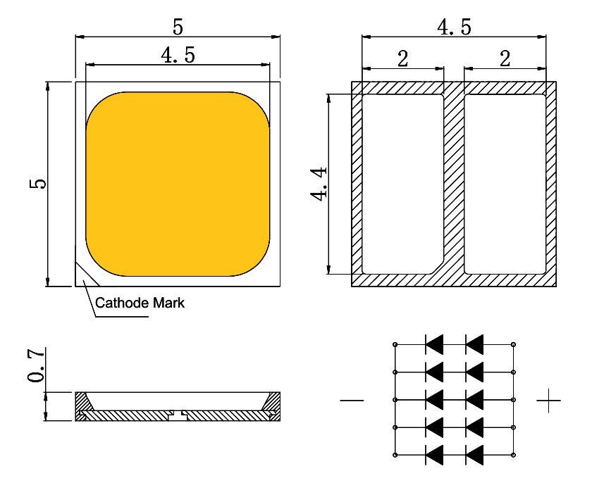 Корпус светодиодов изготовлен из материала EMC, разварка выполнена золотыми проводками.
